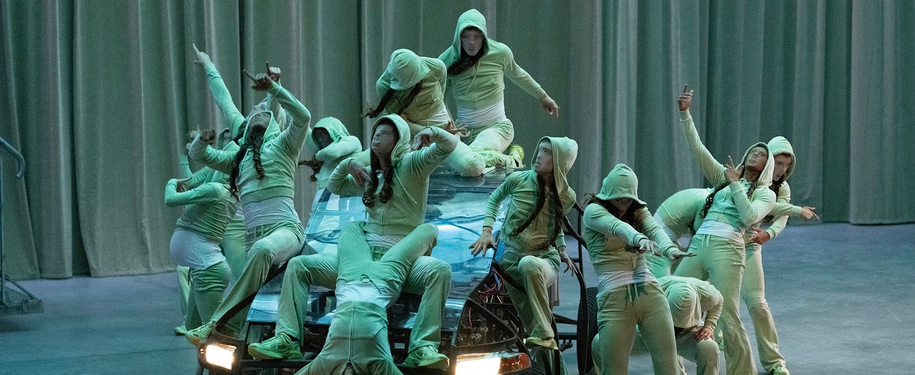 Nous laissons s’écouler le plus de temps possiblele possible avant de figer l’histoire et le récit qui s’imposent à la fin du travail d’écriture. Nos interprètes appartiennent toujours à des communautés spécifiques (jumpstyle, danse traditionnelle géorgienne, cloud chasing…) et les danseurs et danseuses du Ballet national de Marseille représentent pour nous une communauté éphémère internationale traversée par une multitude de récits, de problématiques, de pratiques du corps… C’est à partir d’elle.eux que nous allons travailler. Pour Age Of Content, qui est la deuxième création avec ce groupe, nous avons le désir de pouvoir travailler la diversité des recherches qui donneront naissance à l’oeuvre achevée. Un instantané de nos interrogations et des trouvailles que nous développons à travers elles.
