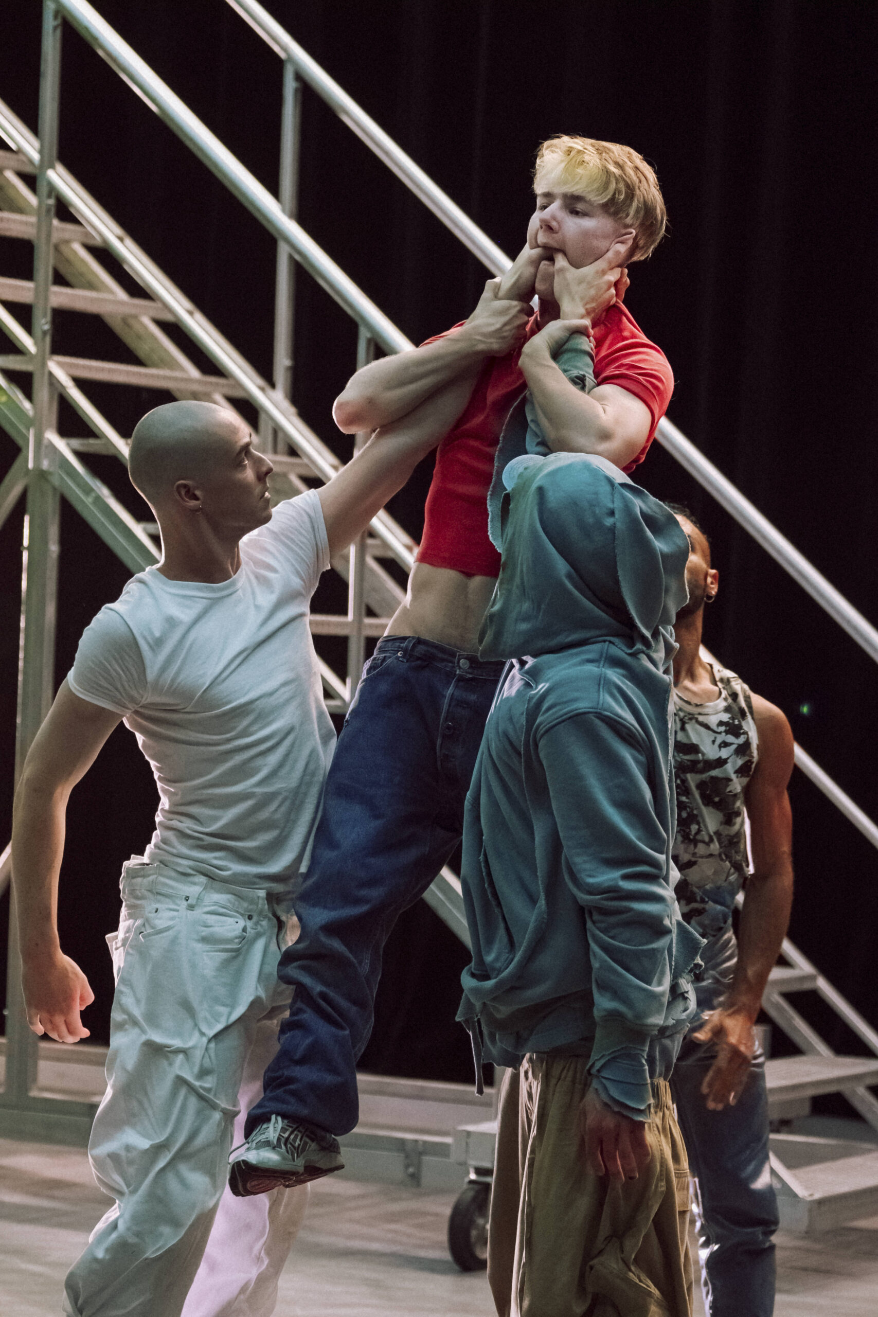 Lors de nos résidences de création, nous souhaitons les familiariser quotidiennement à une diversité de techniquesdiversité techniques et leur faire suivre les enseignements de box.euse.eur.s, de voltigeuse.eur.s, de cascadeuse.eur.s et de circassienne.ens. I.elle.s leur permettront de s’approprier ces techniques de simulation de combat pour être capable à terme de les emmener ailleurs.