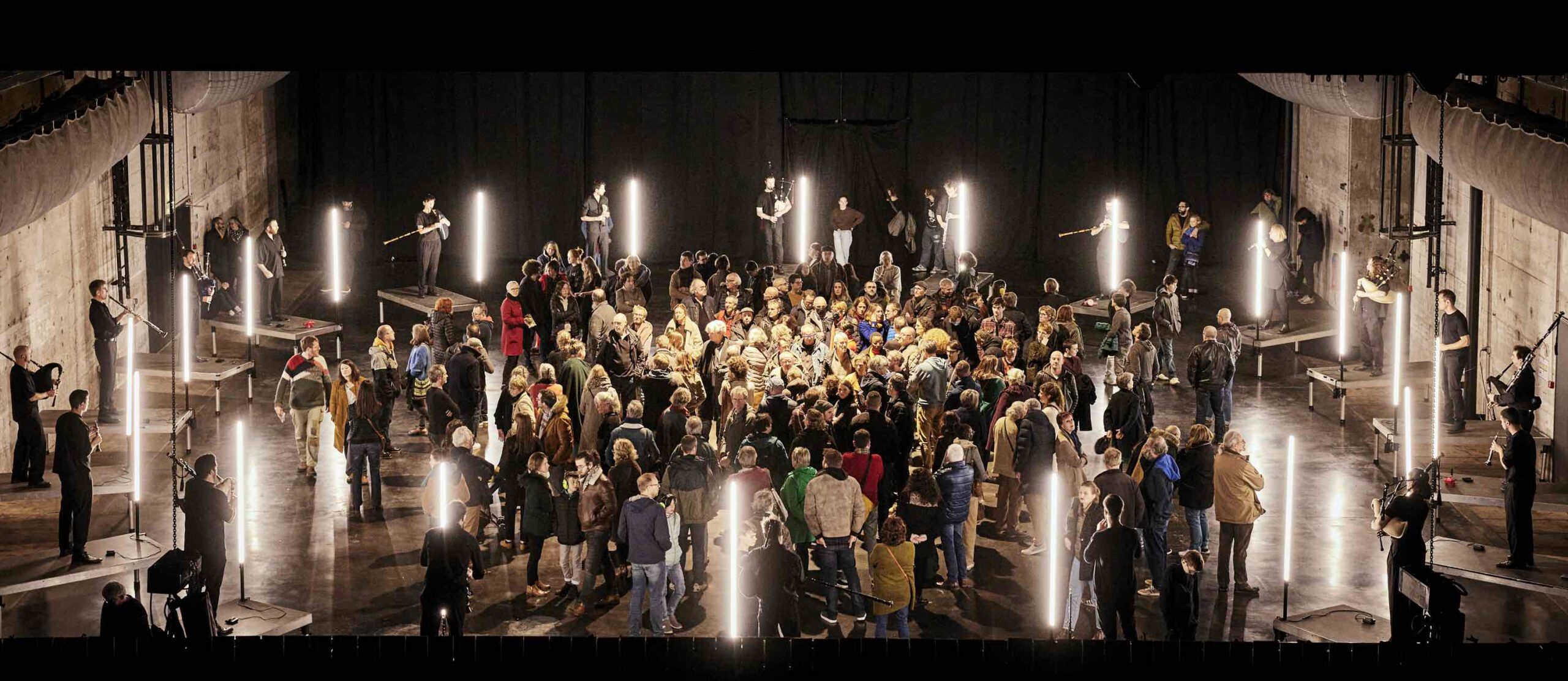 Les vingt sonneurs forment un cercle entourant le public. Ils sont répartis pour que les bourdons des cornemuses créent une enveloppe. La composition par patterns permet de penser chaque musicien, à la fois, comme un soliste et un élément de l’ensemble.